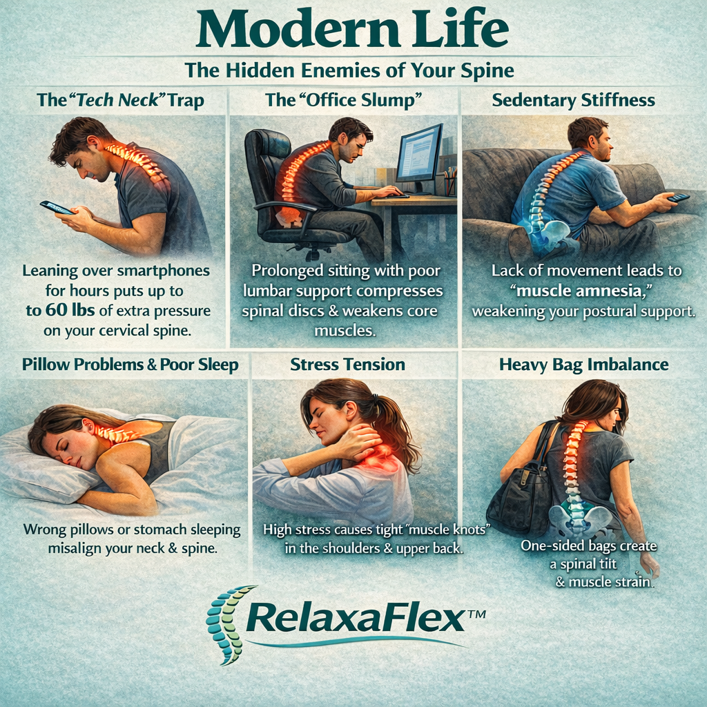 🛋️ Sedentary Stiffness :Lack of movement leads to “muscle amnesia,” leaving your back unstable and sore.